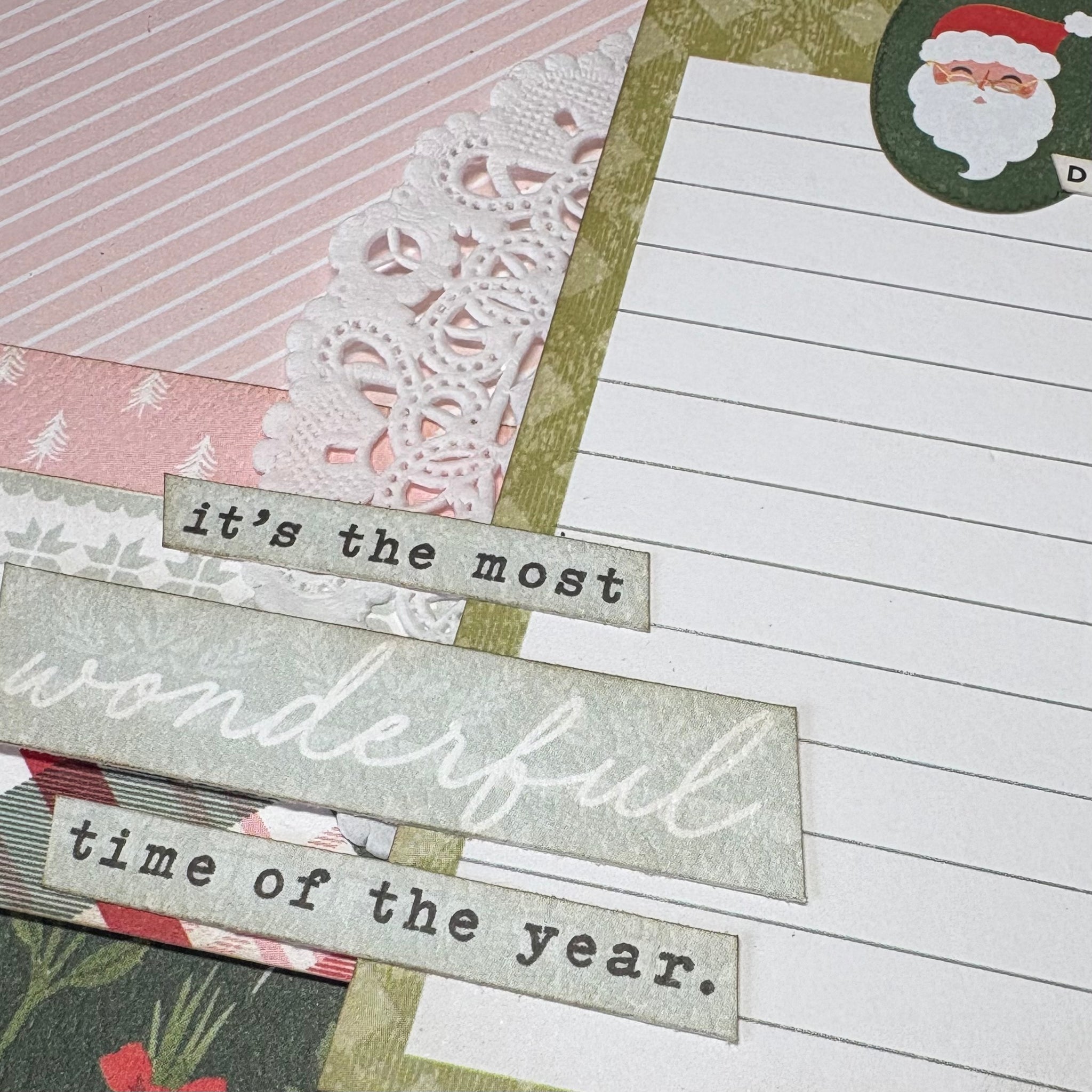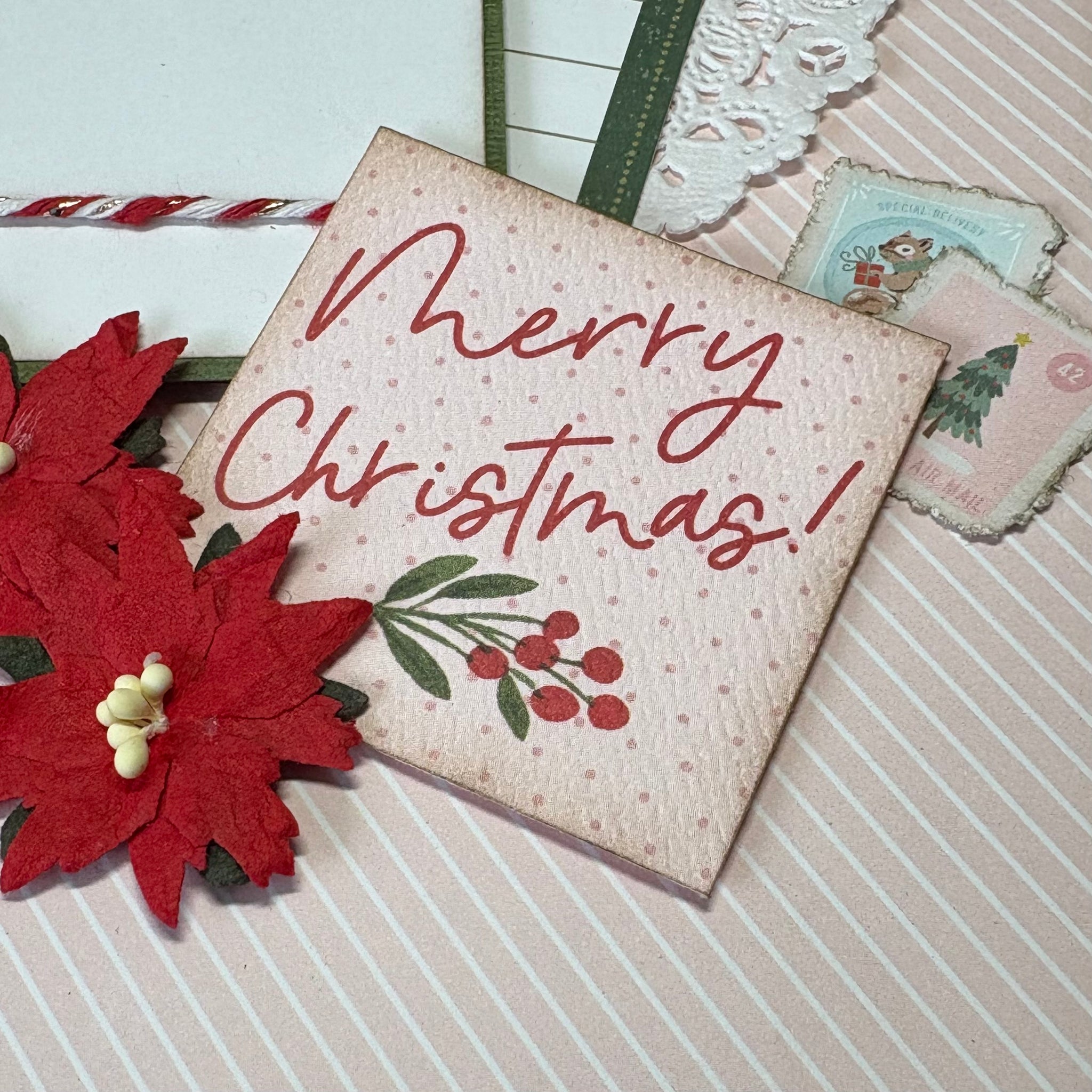 Celebrate the season with this adorable Merry Christmas double page layout in soft pink and teal tones with the traditional red and green. Featuring delicate decorative ephemera including vintage-style stamps and tickets, this layout blends classic holiday charm with a gentle, modern palette.