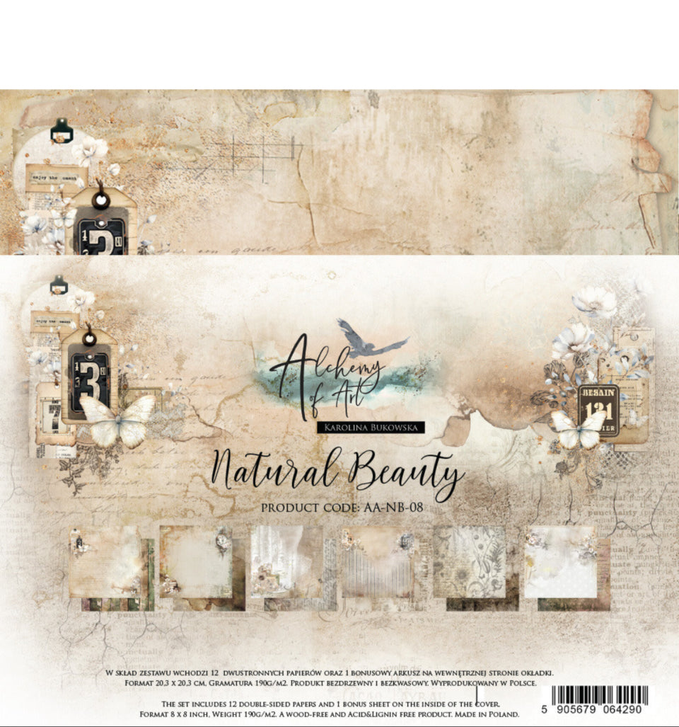 Embrace timeless elegance with Natural Beauty, featuring the exquisite Alchemy of Art collection from Poland. This kit includes 4 single layouts using the collection pack of papers and a set of coordinating junk journal die-cuts, all designed with a soft vintage touch.