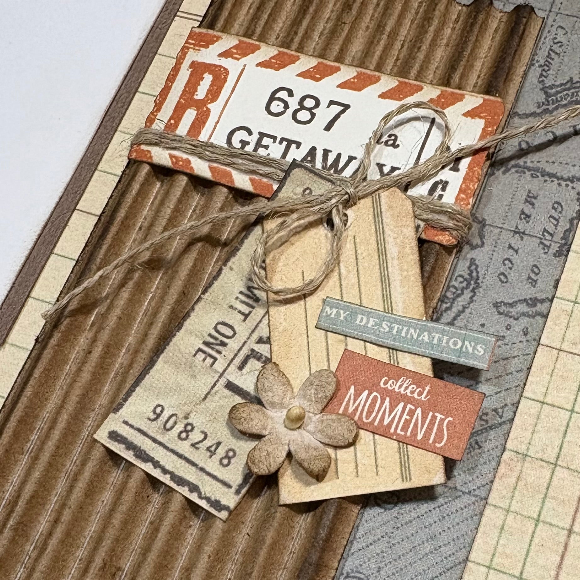 Document your adventures with this beautifully layered double page layout, designed with a vintage travel vibe—maps, tickets, tags, corrugated texture, and worn paper accents come together to create the perfect backdrop for your journey.